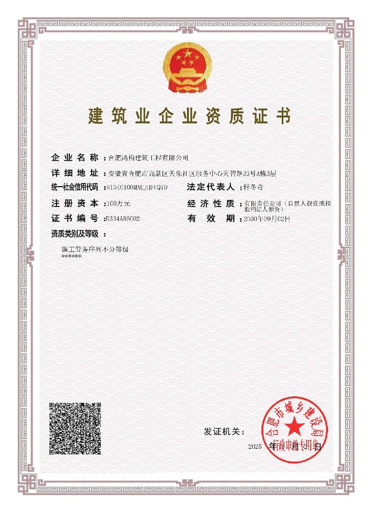 合肥鸿构建筑工程有限公司成立于2025年4月27日,为合肥鸿构控股有限公司全资控股的小微企业,业务覆盖建设工程施工、设计、监理、测绘、公路水运工程监理、建筑劳务分包等全产业链许可项目,以及工程管理、园林绿化、设备租赁等一般项目,依托母公司资源形成一体化服务能力,凭借全资质覆盖与集团化运营架构,在区域市场中具备一定竞争力。